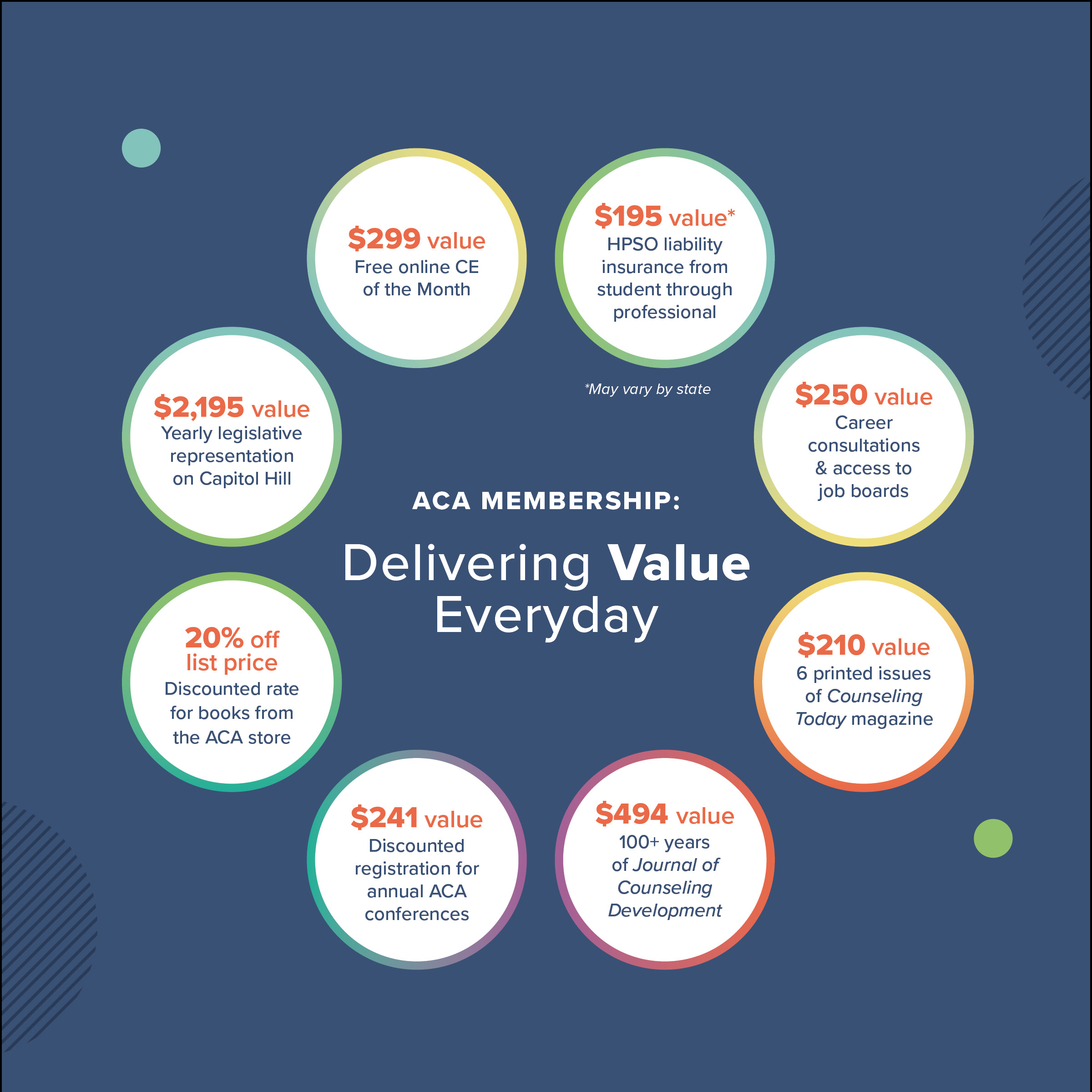 We are the only organization committed to advancing the profession and career path of counselors through advocacy efforts, learning and continuing education, member savings programs, networking opportunities, and more. You deserve to be connected to this unique community throughout your education experience, practice setting and overall professional journey. We are here for you!